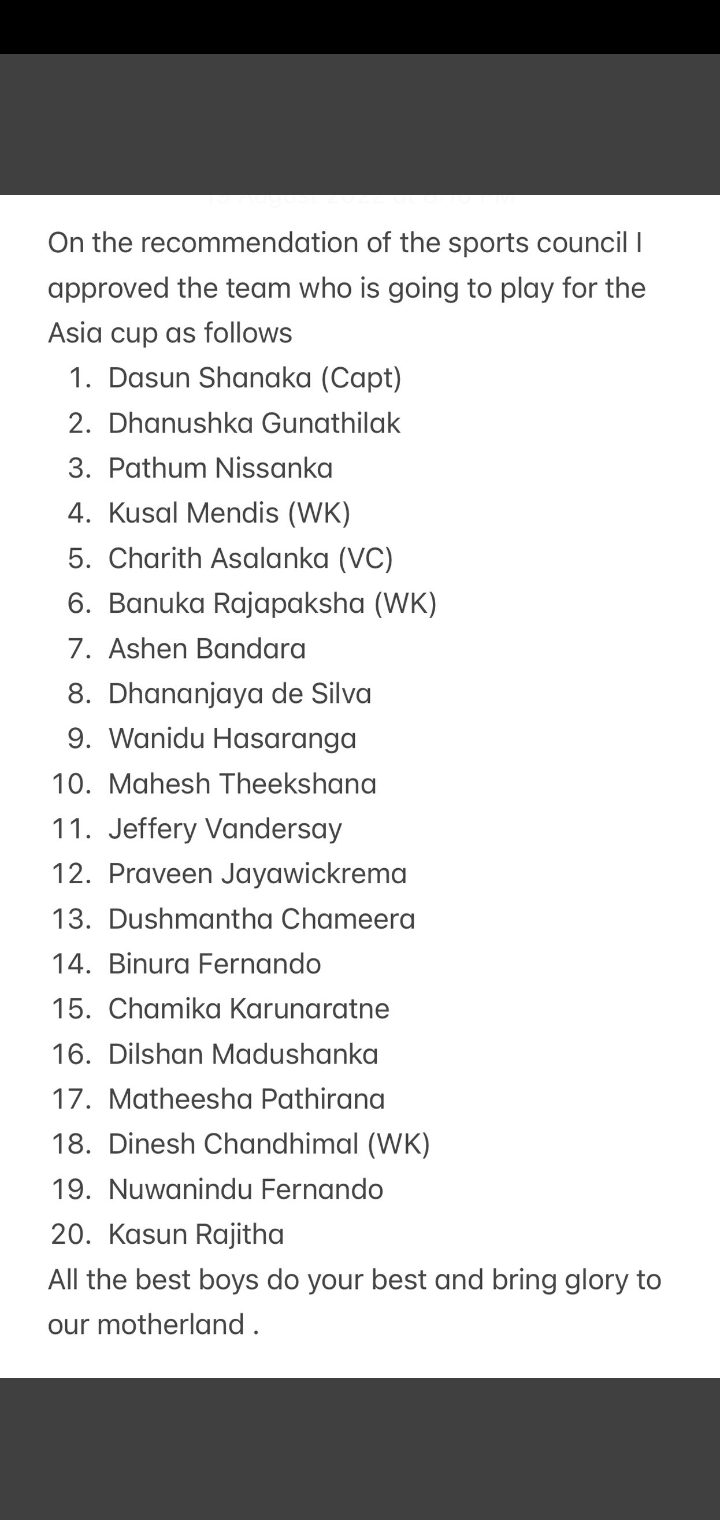 ආසියානු කුසලාන පන්දුවාර 20යි 20 ක්රිකට් තරගාවලිය සදහා වන ශ්රී ලංකා සංචිතය ක්රීඩා අමාත්ය රොෂාන් රණසිංහ මහතා විසින් නිවේදනය කර තිබෙනවා.