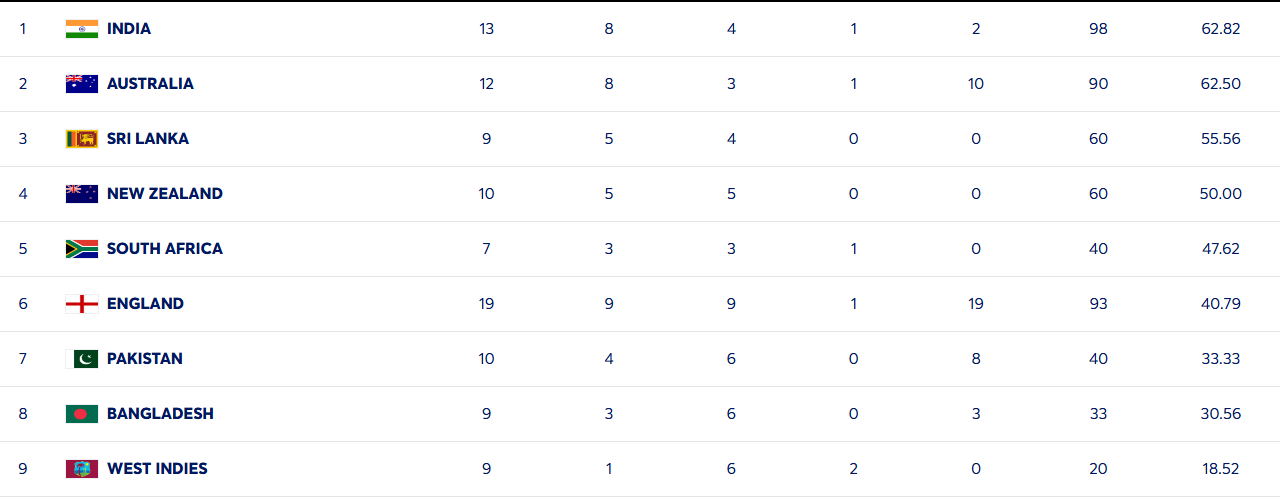 කෙසේ වෙතත්, ඔවුන්ට හිමිව තිබූ 68.06% ක ලකුණු ප්රතිශතය මේ වන විට 62.82 දක්වා පහත වැටී තිබීම විශේෂත්වයක්. දෙවැනි ස්ථානයේ රැදී සිටින ඔස්ට්රේලියාවට 62.50% ක ලකුණු ප්රතිශතයක් හිමියි. ඒ අනුව එම කණ්ඩායම් දෙක අතර පරතරය වන්නේ 0.32% ක්.