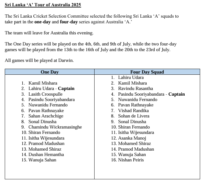 ඔස්ට්රේලියානු තරග සංචාරය සදහා ක්රීඩා කරන ශ්රී ලංකා ඒ සංචිත නිවේදනය කර තිබෙනවා.