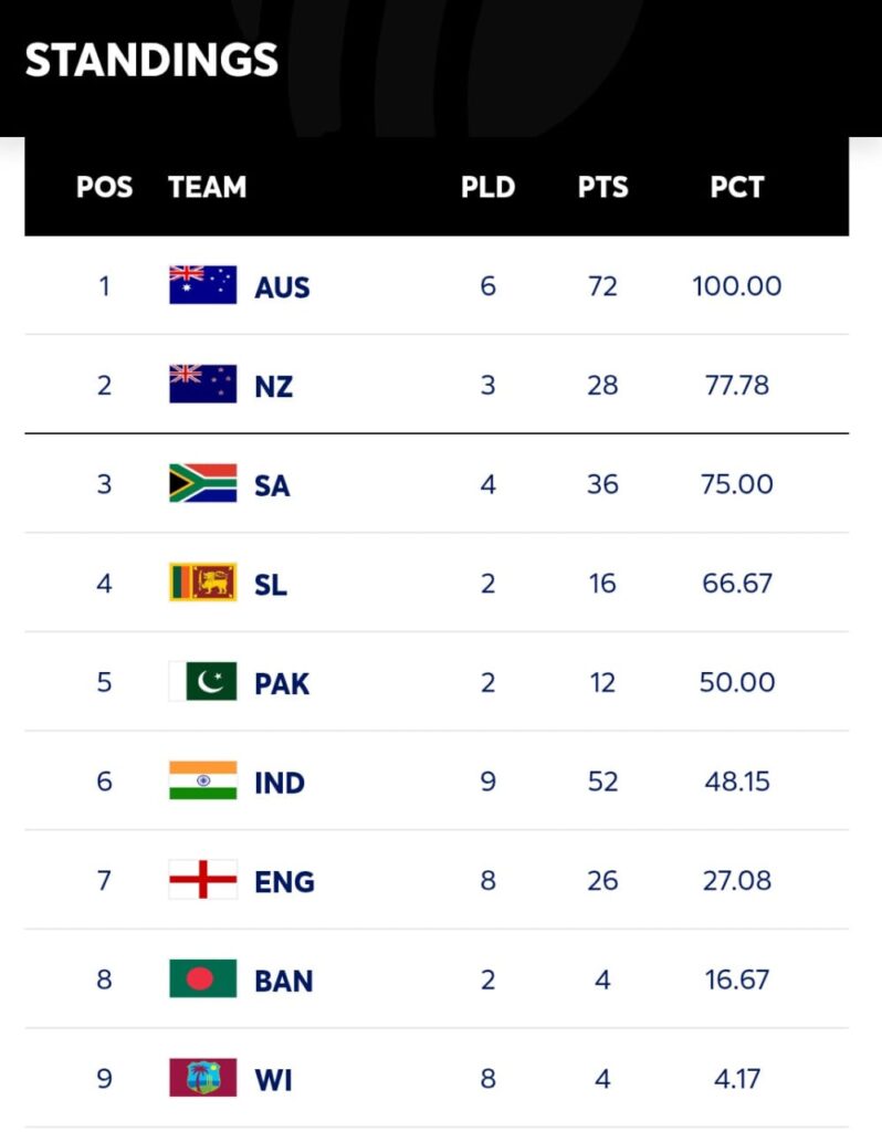 තරග හයකින් තරග හයම ජය ගත් ඔස්ට්රේලියාව 100% ක ලකුණු ප්රතිශතයක් සමග තවමත් ප්රසාද ලකුණු සටහනේ පෙරමුණේ පසුවනවා.