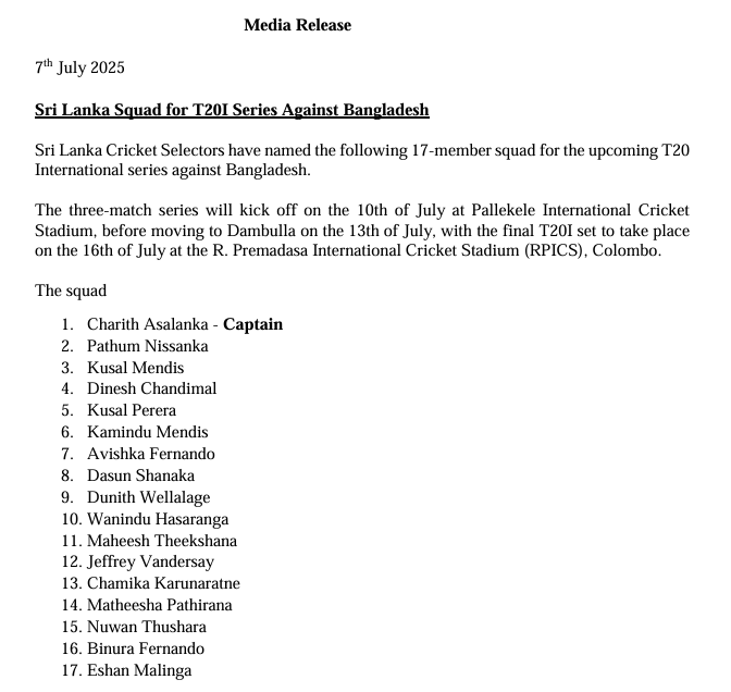 බංග්ලාදේශය සමග පැවැත්වීමට නියමිත තරග 3 කින් යුත් පන්දුවාර විස්සයි 20 ක්රිකට් තරගාවලිය සදහා වන ශ්රී ලංකා සංචිතය නම් කර තිබෙනවා.
