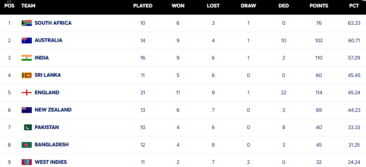 ශ්රී ලංකාව මේ වන විට 45.45% ලකුණු ප්රතිශතයක් හිමි කර ගනිමින් ප්රසාද ලකුණු සටහනේ සිව්වැනි ස්ථානයේ පසුවන අතර, ඔවුන් ඉදිරියේදී ඔස්ට්රේලියාවට එරෙහිව මෙරටදී තරග දෙකකින් යුත් ටෙස්ට් තරගාවලියක් ක්රීඩා කිරීමට නියමිතයි.