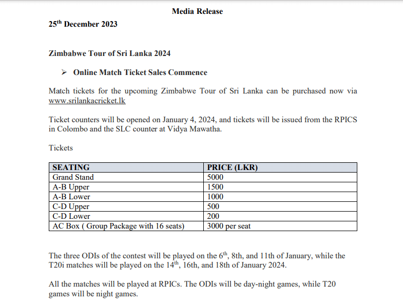 සිම්බාබ්වේ කණ්ඩායමේ ශ්රී ලංකා තරග සංචාරයට අදාළ ප්රවේශ පත්ර මිලදී ගත හැකි ආකාරය හා මිල ගණන් ශ්රී ලංකා ක්රිකට් ආයතනය විසින් අද(25) නිවේදනය කළා.