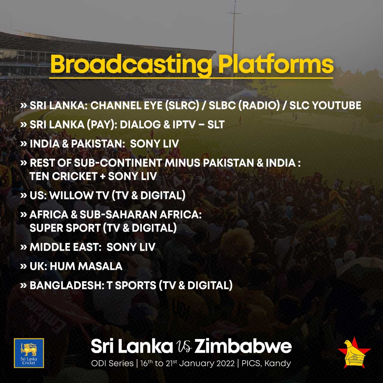 සංචාරක සිම්බාබ්වේ කණ්ඩායම හා ශ්රී ලංකා කණ්ඩායම අතර පැවැත්වෙන තරග 3කින් යුත් එක්දින ක්රිකට් තරගාවලියේ විකාශන කටයුතු සිදු කරන නාලිකා හා ජාත්යන්තර විස්තර විචාරක කමිටුව නිවේදනය කර තිබෙනවා.
