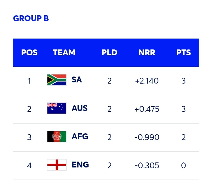එම කාණ්ඩය යටතේ තවත් තරග දෙකක් පැවැත්වීමට නියමිතයි. එහිදී ඇෆ්ඝනිස්තාන කණ්ඩායම ඔස්ට්‍රේලියාවට එරෙහිවත්, දකුණු අප්‍රිකා කණ්ඩායම එංගලන්තයට එරෙහිවත් තරග වැදීමට නියමිතව තිබෙනවා.