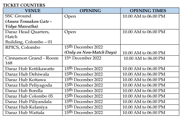 ඒ අනුව Daraz ( https://click.daraz.lk/e/_6gJbD ) ඔස්සේ අන්තර්ජාලය හරහා ප්රවේශ පත්ර මිලදී ගත හැකි බවයි ක්රිකට් ආයතනය නිවේදනය කළේ.