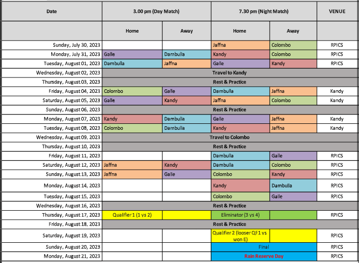 ජූලි 30 වැනිදා සිට අගෝස්තු 20 වැනිදා දක්වා තරගාවලිය පැවැත්වීමට නියමිත අතර, තරගාවලියේ සමාරම්භක තරගය ජැෆ්නා කිංග්ස් කණ්ඩායම හා කලම්බු ස්ට්රයිකර්ස් කණ්ඩායම අතර පැවැත්වීමට නියමිතයි. එම තරගය ජූලි 30 වැනිදා කොළඹ ආර්. ප්රේමදාස ක්රීඩාංගනයේ දී රාත්රී 7.30 ට ආරම්භ වීමට නියමිතයි.