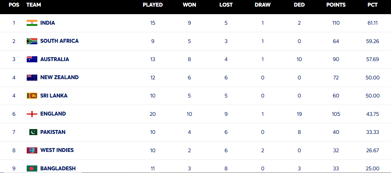 ඒ අනුව ඊයේ වන තුරු දෙවැනි ස්ථානයේ රැදී සිටි ඔස්ට්‍රේලියාව තෙවැනි ස්ථානය දක්වා පසුබැසීමකට ලක් වුණා. සිව්වැනි ස්ථානයේ රැදී සිටි නවසීලන්තයට හිමිව තිබූ ලකුණු ප්‍රතිශතය 54.55% ක්.