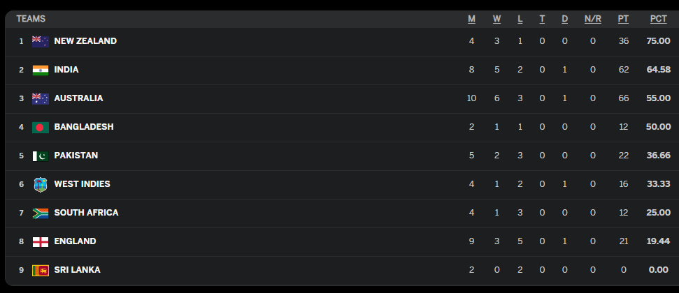 ලැබූ ජයත් සමග ඉන්දියාවට තවත් ප්රසාද ලකුණු 12 ක් හිමි වූ අතර, ඒ අනුව ඔවුන්ගේ ලකුණු ප්රතිශතය 59.52 සිට 64.58 දක්වා ඉහළ ගොස් තිබෙනවා.