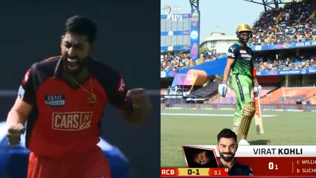 ඒ, විරාට් කෝලි පළමු පන්දුවෙන්ම දවා ගැනීමට දග පන්දු යවන ක්රීඩක ජගදීෂ සුචිත් සමත් වීමත් සමගයි.