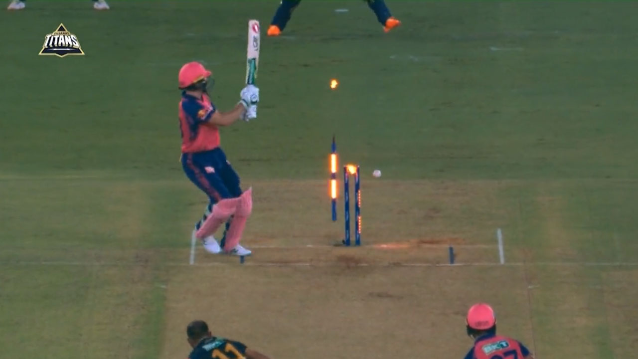 බට්ලර් fine leg කලාපයට scoop පහරක් එල්ල කිරීමට යාමේ දී දැවී ගියේ මොහමඩ් ෂාමි යොමු කළ පන්දුව කෙළින්ම කඩුල්ලේ වැදීමෙන්. (දර්ශන පහතින්)